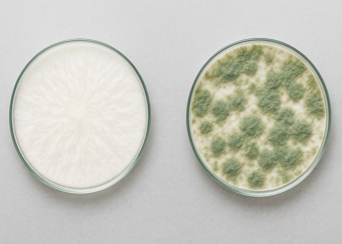 Визуально на ранней стадии триходерму легко принять за здоровый мицелий Psilocybe cubensis — она также образует белый, пушистый налет, который быстро распространяется по поверхности субстрата. Именно это сходство делает раннюю диагностику сложной, особенно для новичков.
