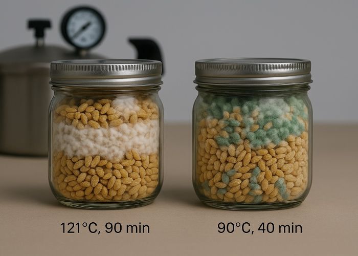 Для зерна, кокоса, соломы, опилок и любых целлюлозосодержащих субстратов необходима стерилизация при 121 °C не менее 90 минут.